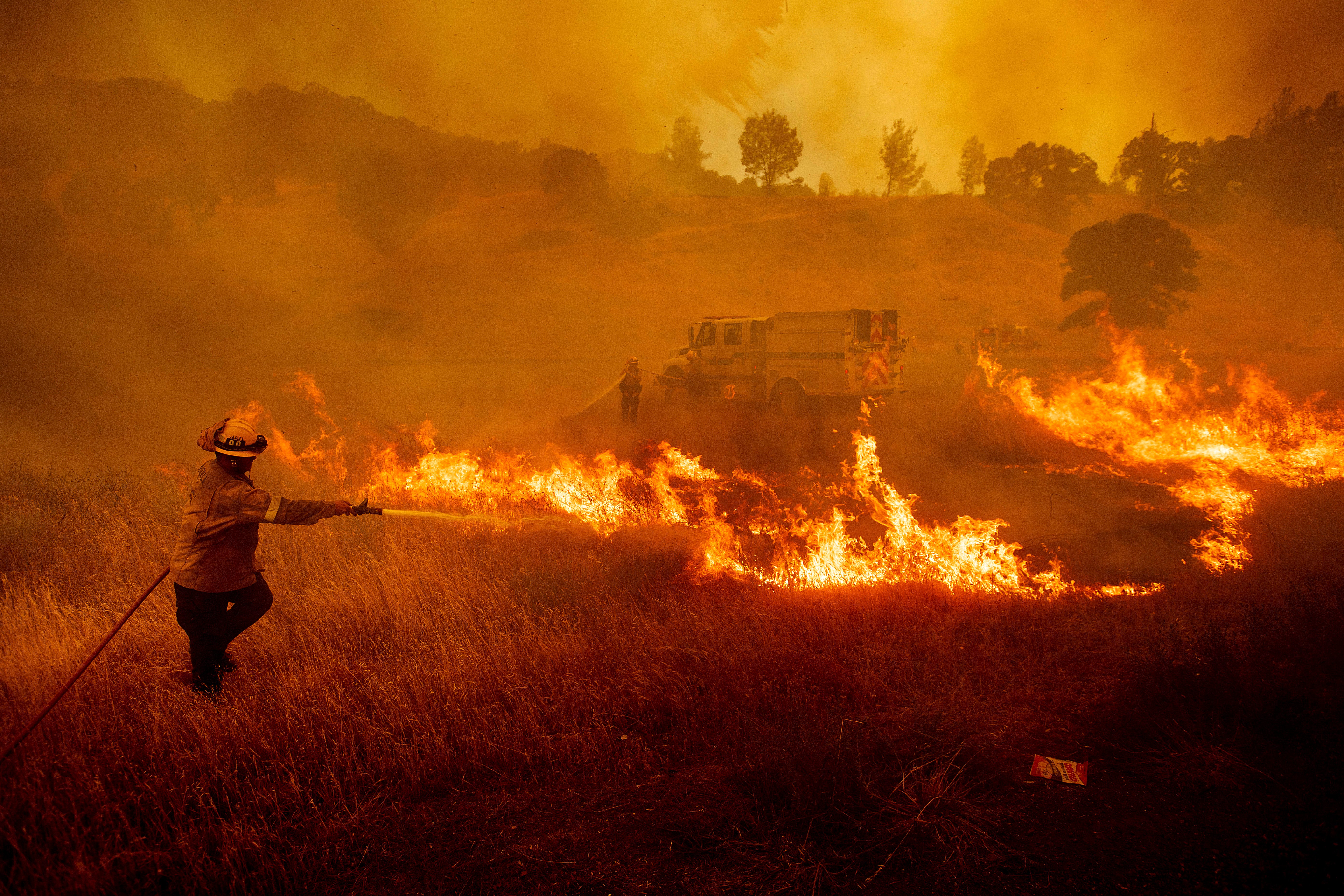 California authorities ordered evacuations northwest of Sacramento on Sunday because a wildfire burned at least 34 square miles of dry brush and threatened two dozen structures. The fire sent a plume of smoke 75 miles toward San Francisco. The fire was between Sacramento and Lake Berryessa.